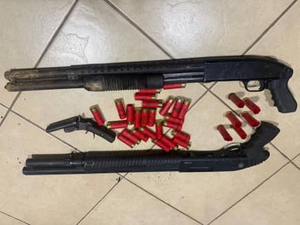 Exhibits retrieved from the scene included two pump-action guns loaded with six rounds of ammunition each, an unbranded pistol, as well as a sack containing 25 live cartridges and six spent shells.
